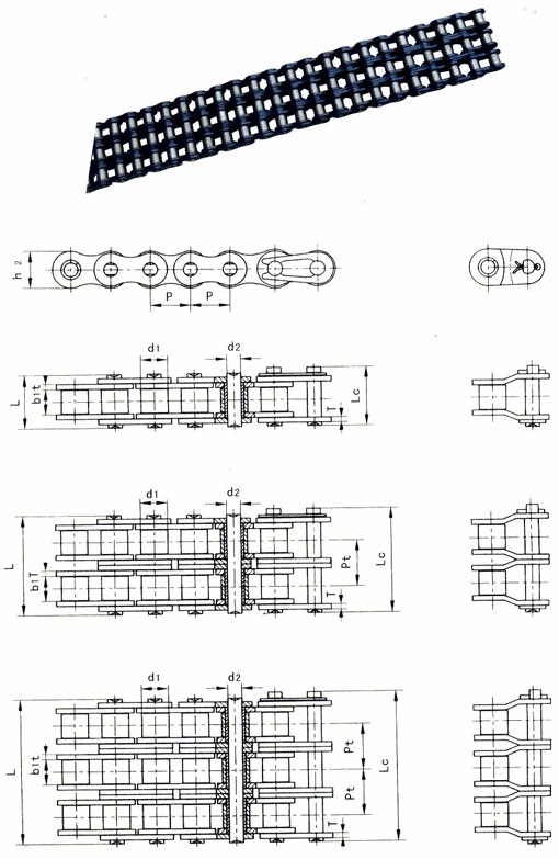 | ISO BS链号Chain No. | 节距Pitch | 滚子直径Roller diameter | 内节内宽Pitxh | 销轴直径Pin diameter | 销轴长度Pin length | 连接销轴长度Connecting pin shaft length | 内链板高度Plate depth | 排距Pitch | 极限拉伸载荷Limit tensile load | 平均拉伸载荷 Average tensile load | 每米重量 Weight per meter |